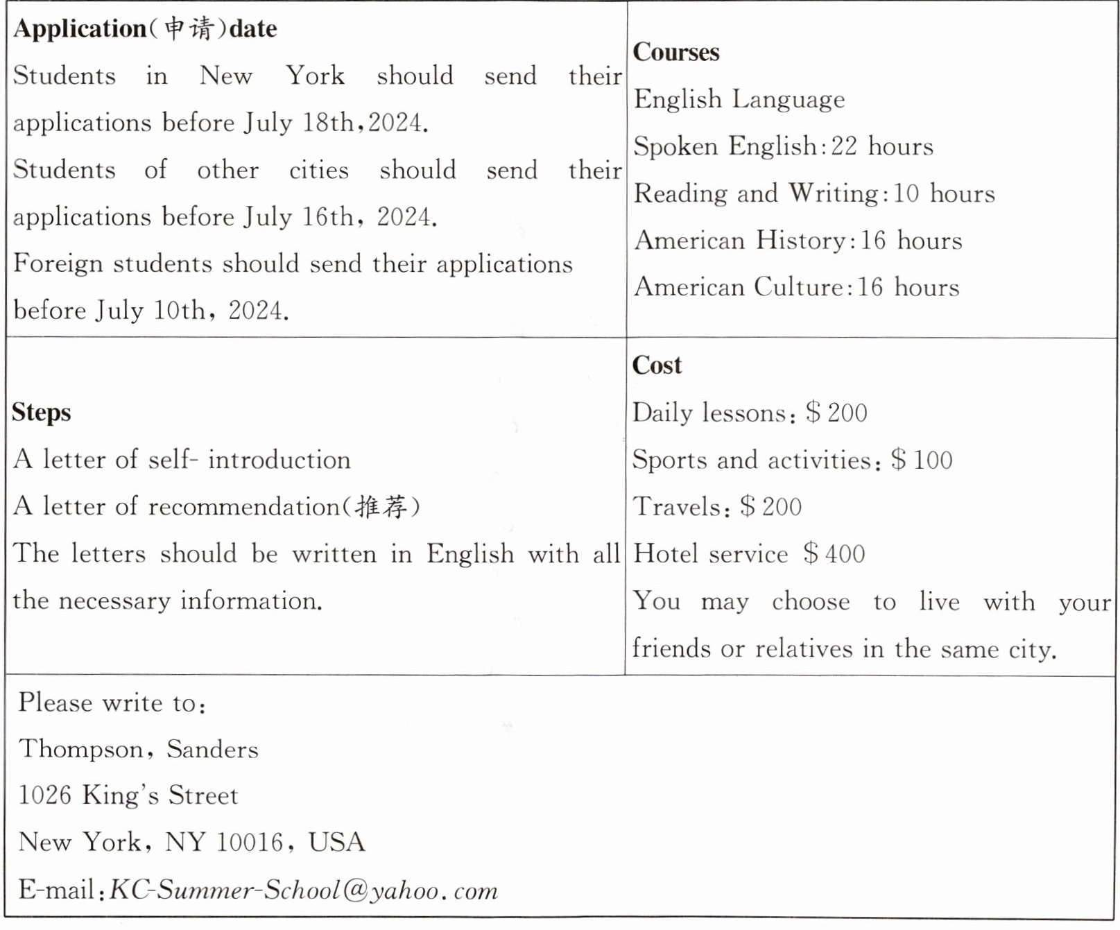 King's College Summer School is an annual(每年的)training program for high school students at all levels who want to improve their English. Courses are given by the teachers of King's College and other colleges in New York. Trips to museums and culture centers are also organized. This year's summer school will be from July 25th to August 15th. More information is as follows: