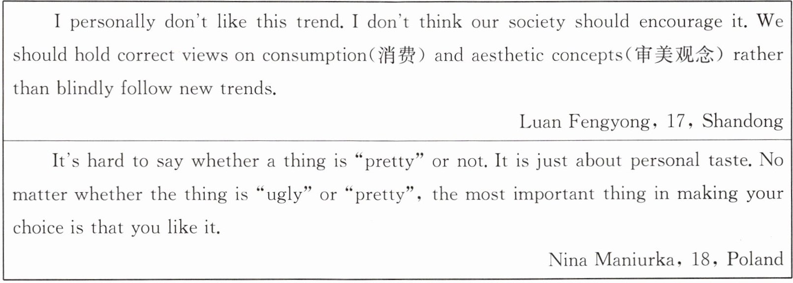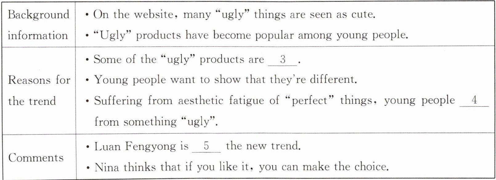 According to Zhang Lei,a professor at Zhejiang University of Technology,the rise in the popularity of “ugly” things means that young people want to show that they’re different. Suffering(遭受) from aesthetic fatigue(审美疲劳) of “perfect” things,these “ugly” things do please young people a lot.