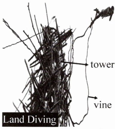 Most people know something about bungee jumping. But did you know that bungee jumping started on Pentecost Island in Vanuatu almost 15 centuries ago? And this sport is from an activity called land diving. Land diving is part of a religious ceremony(宗教庆典). A man ties two tree vines around his ankles. He then climbs a wooden tower around 20 to 30 meters high,crosses his arms,and jumps headfirst. The goal is to touch the earth with the top of his head without breaking the vines or hitting the ground hard. Even though this activity may put people in great danger,every spring,lots of local boys and men still attend this amazing test of bravery. Women are not allowed to dive,but they cheer the divers on by dancing and singing. Many tourists come to the island every year to watch this ancient tradition.