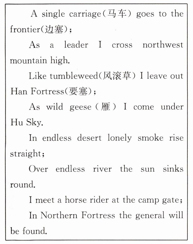 On Mission to the Frontier is a five-character poem by Wang Wei(AD 701-761),one of the most famous poets and artists of the Tang Dynasty. The poem begins with a carriage,tumbleweed and wild geese,which aren't usually connected with royalty(朝廷). 1 This is because he was sent to the frontier by Emperor Tang Xuanzong(AD 685-762) to stay there for about eight years.