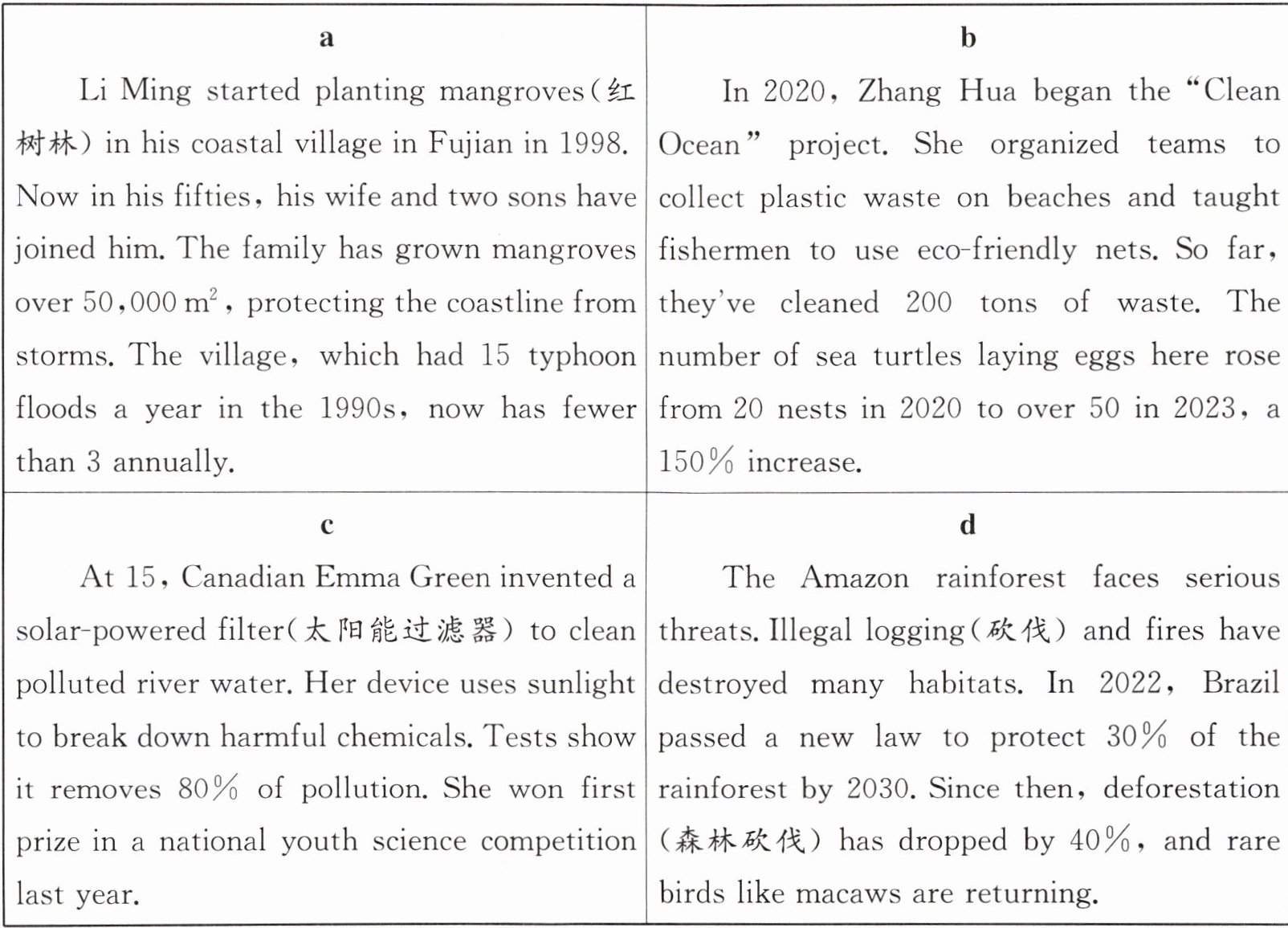 )4. What can we infer from the passages? A. Li Ming’s village will never have floods. B. The Amazon rainforest’s future is hopeful. C. Emma’s filter is used worldwide now.(
