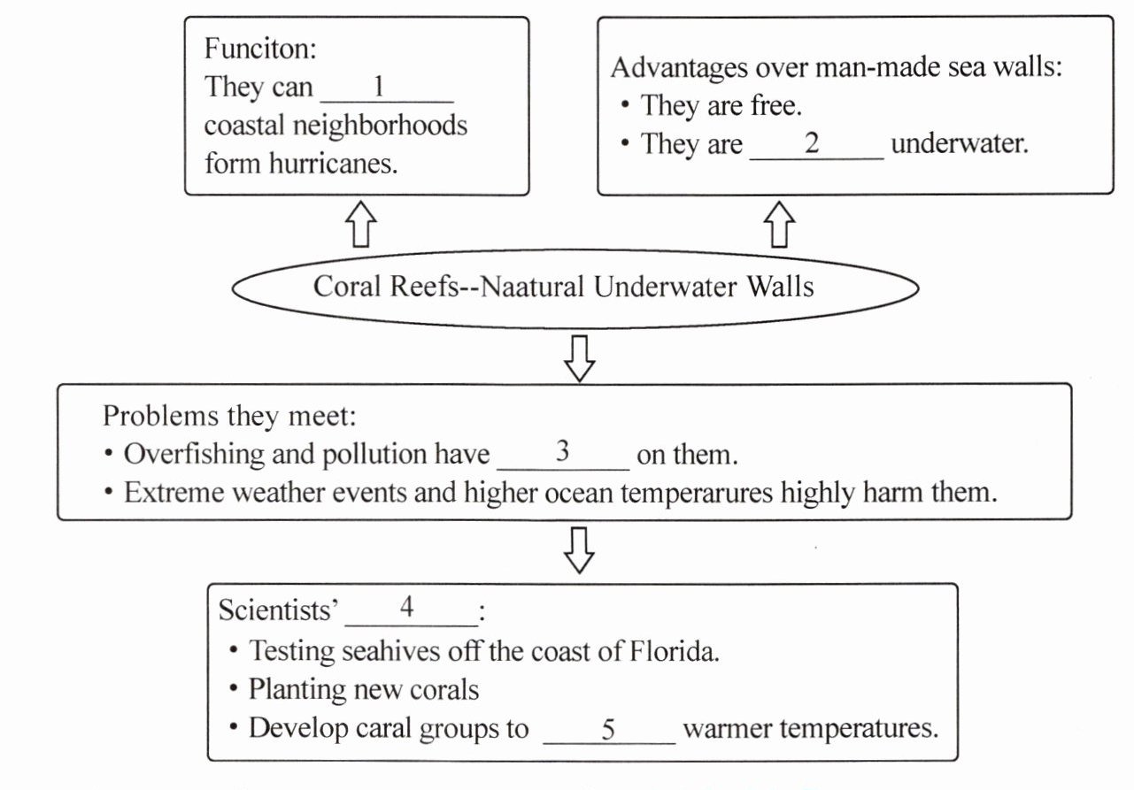 Did you know that coral reefs can act as underwater walls? As natural “walls” underwater,reefs can help reduce the influence of hurricanes(飓风) on coastal(沿海的)neighborhoods. This may seem surprising,as coral reefs are often among the hardest hit during hurricanes. Yet,scientists have discovered reefs themselves can reduce the influence of hurricanes. In fact,coral reefs work better than man-made sea walls. These projects are not only costly,but also easily damaged(损害) underwater. Such roles of coral reefs have long been noticed by scientists. One 2018 study focused on Ningaloo Reef in Australia. During a heavy hurricane,the Reef well stopped the coastline from being hit hard. However,parts of the Western Australia’s Coast without coral reefs were terribly damaged. More recently,researchers at the University if Miami have reached the same conclusion. They used a special lab simulator(模拟器)to recreate ocean conditions during a heavy hurricane. The researchers used seahives(海蜂巢)to test coral strength in the simulator. They found that seahives with corals could reduce the influence of the “hurricane” by up to 95 percent! However,overfishing and pollution have caused problems to coral reefs. Since 1950,half of the world’s corals have already been lost. At the same time,climate change is causing more extreme(极端的)weather events which put corals under more stress. Because of higher ocean temperatures,some kinds of coral reefs are whitening and dying out.