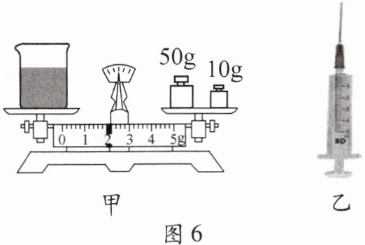 8.某实验小组准备测量酸奶的密度。他们先将酸奶倒入烧杯,用天平测量烧杯和酸奶的总质量$m_1$,天平保持平衡时的情景如图6甲所示;接着找来5 mL的注射器针筒(如图6乙),抽取酸奶至5 mL刻度处,测得烧杯和剩余酸奶的总质量$m_2=56.4$ g。下列分析正确的是(
