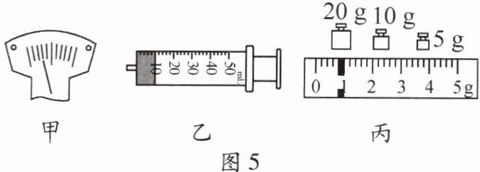 (3)小聪用注射器继续抽取酒精至20 mL刻度处,再将注射器放到天平上,测得注射器和酒精的总质量如图5丙所示,为