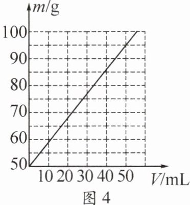 (1)根据实验数据,小明画出了食用油和烧杯的总质量m与食用油的体积V之间关系的图像,如图4所示。分析图像可知,烧杯的质量为