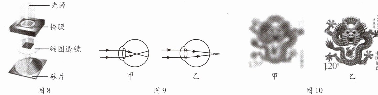 12.2023年2月哈工大宣布突破EUV光刻机关键技术,光刻技术是利用缩图透镜将绘制在掩膜上的电路图通过光源投射到涂有光刻胶的硅片上,从而制造出集成电路的方法,其工作原理如图8所示。若图中掩膜上的电路图在硅片上成清晰缩小的像,下列说法正确的是(