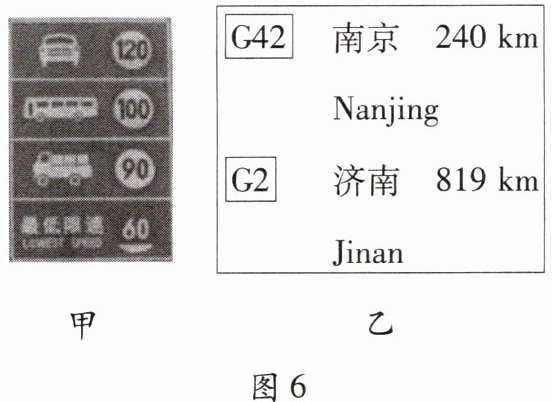 14. 沪宁高速公路入口处有图6甲所示的标志牌,当小明乘坐旅游大巴经过图6乙所示的标志牌时,下列说法正确的是 (
