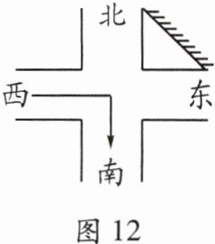 3. 如图12年示,十字路口东北角楼房上镶着面对正西南方向的平面大玻璃,一辆小车向东行驶到十字路口并向南转弯,则小车在平面镜中的行驶方向是(