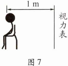 10. (2024·邵东)视力检查中,要求被测者的眼睛与视力表的距离是5 m。为节省空间,视力表常挂在被测者的后方,通过对面墙上的平面镜成像在被测者前方,如图7所示,此时被测者眼睛与平面镜的距离应为(