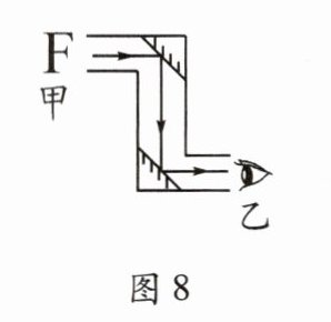 11. 图8所示是小明自制的潜望镜,利用它能在隐蔽处观察到外面的情况。当它正对甲处的“F”光源时,人眼在乙处观察到的像是(
