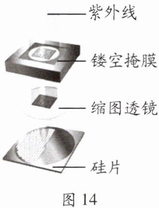 2. 光刻机是用来生产芯片的关键设备,其工作原理如图14所示。用紫外线照射镂空掩膜,调整镂空掩膜、缩图透镜的位置,恰好能在硅片上成极小的清晰的像,从而实现集成电路的“光刻”。下列说法正确的是(
