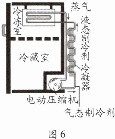 某兴趣小组的同学对电冰箱的制冷原理进行了跨学科实践探究。研究发现,电冰箱利用制冷剂作为热的“搬运工”,制冷剂在电动压缩机的驱使下,在密封的管道内循环流动,将冰箱内的热量带到冰箱外,达到制冷的目的,如图6所示。