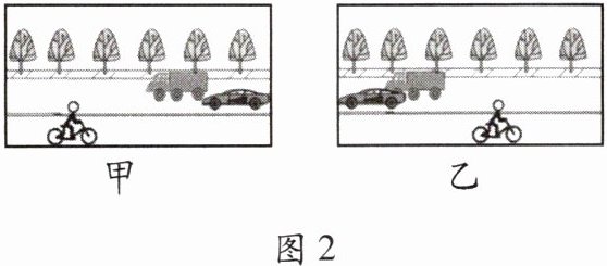 3.小强在马路边拍街景,连续拍了两张,如图2所示。如果以轿车为参照物,树向