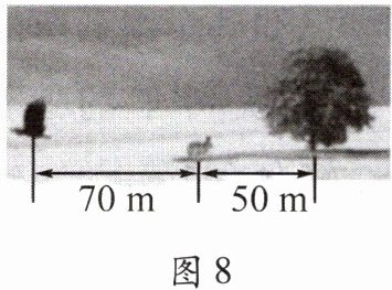 3.如图8所示,野兔在草地上以20 m/s的速度向前方50 m处的树洞沿直线奔逃,秃鹰在野兔正后方70 m处以40 m/s的速度贴着地面飞行追击野兔。野兔跑到洞口需要的时间是