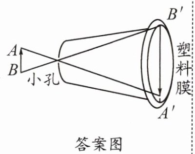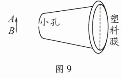 16.如图9所示是小强在纸杯上蒙一层塑料膜做小孔成像实验的情景,请在图中作出烛焰(用 AB 表示)在塑料膜上成的像(用箭头 A'B'表示)及光路图。