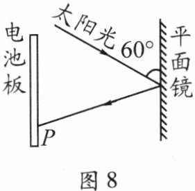 3. 热爱科学的小明在房间里安装了一块太阳能电池板给家里供电。当太阳在电池板后方时,利用一块平面镜将太阳光反射到电池板上。若某时刻太阳光与平面镜的夹角为60°(如图8),一束太阳光经镜面反射后照射到电池板上的P点。下列说法正确的是( )