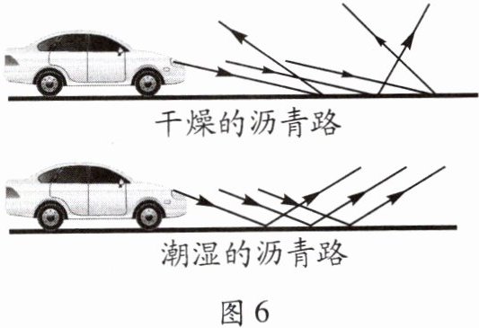 10. 图6所示是晚上汽车分别在干燥的沥青路面上和潮湿的沥青路面上行驶时大灯照射时的部分光路简图。在晚上开车时,下列说法正确的是( )