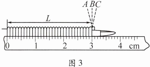 4. 某创新小组用图3所示的方法测量细铜丝的直径:①将细铜丝拉直,然后将它紧密缠绕在粗细均匀的铅笔杆上;②数出缠绕在铅笔杆上的细铜丝的圈数n;③用刻度尺测出铅笔杆上细铜丝绕圈的总长度L;④细铜丝的直径$d=\frac{L}{n}$。(1)小组同学使用的刻度尺的分度值为