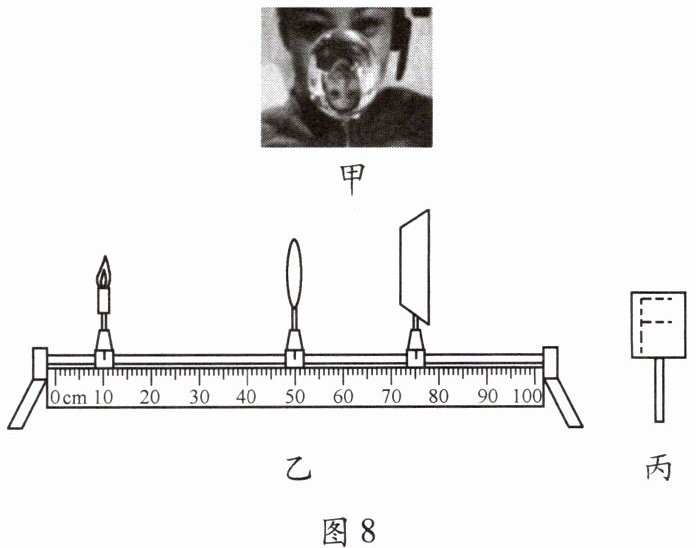 16. 图8甲所示是天宫课堂中航天员王亚平讲授“水球光学实验”时的情景,受此影响,“飞天”兴趣小组利用图8乙所示的实验装置开展了“凸透镜成像规律”的探究实验。