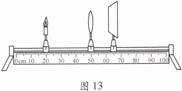 (3)小潘将蜡烛放在光具座10 cm刻度线处,移动光屏到图12所示的位置,光屏上恰好呈现一清晰的像,该像的性质是倒立、
