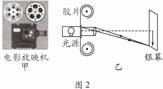 2. 图2甲所示为电影放映机,其成像原理如图2乙所示。为了让观众看到清晰的实像,应将胶片放在距离透镜