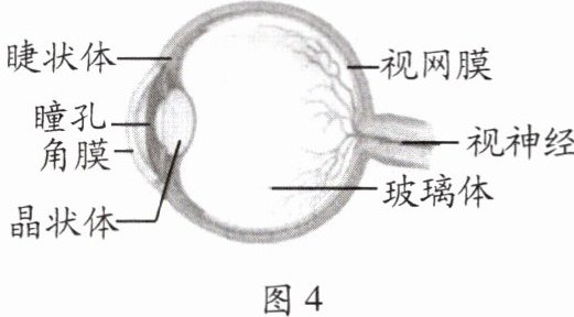 5. 图4所示是人眼球的结构图,眼球好像一架照相机,晶状体和角膜的共同作用相当于一个凸透镜,把来自物体的光会聚在视网膜上,形成物体的像。物体在视网膜上成的是(