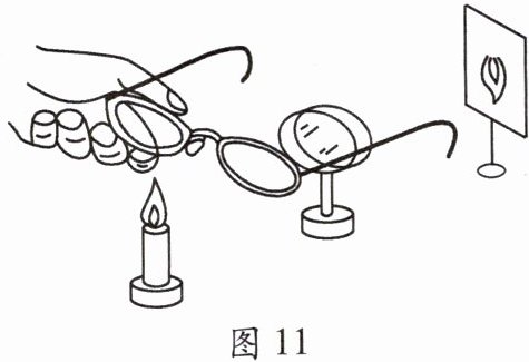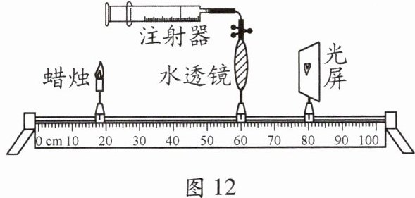 2. 在“爱眼日”宣传活动中,小明用图12所示的装置探究眼睛的成像,此时烛焰在光屏上成清晰的像,用此模拟正常眼睛的成像。接下来,下列操作可模拟近视眼的是(