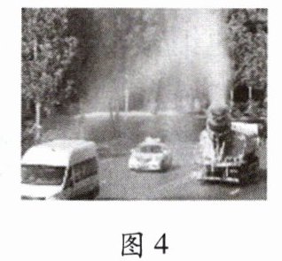 3. 如图所示,雾炮车利用大型鼓风机向空中喷射水雾,吸附空气中的PM₂.₅颗粒,若天气晴朗,望向水雾可能会看到美丽的“彩虹”,这种现象在物理学上属于光的