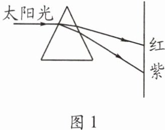 1. 如图所示,一束太阳光通过三棱镜后,在光屏上呈现彩色光带,这种现象叫作光的