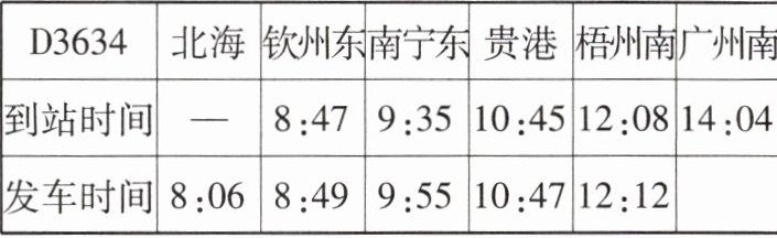 15. 动车方便了人们的出行,由北海开往广州南的D3634次动车运行的部分时刻表如下表所示。由表可知,本次动车由南宁东站运行到广州南站需要的时间是 (