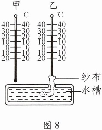 3.如图8所示,干湿泡温度计是由两支相同的温度计组成的。使用时,一支温度计下端的玻璃泡包着湿纱布并浸在水中,另一支温度计的玻璃泡不包湿纱布。关于干湿泡温度计,下列说法正确的是(