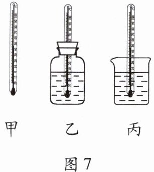 2.如图7所示,两容器装的都是酒精(都较长时间地存放在室内),甲、乙、丙三支温度计的示数都是22℃,其中一支温度计的示数是不准确的。不准确的那支温度计是(