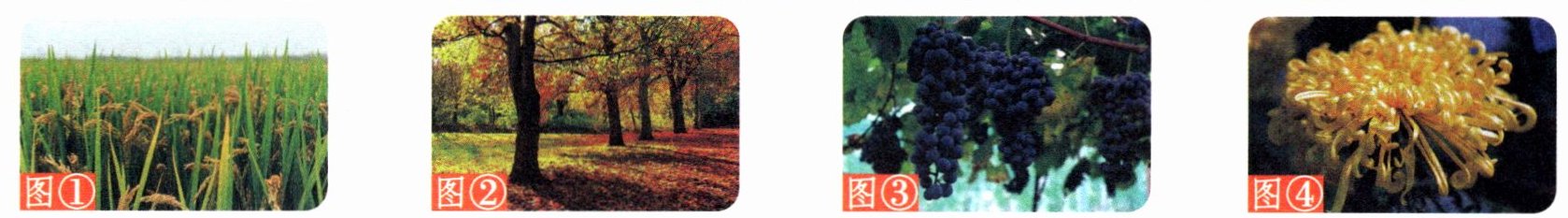 图①水稻收获,稻田流金。 图②红黄相映,赏叶时节。 图③葡萄丰收,游客满园。