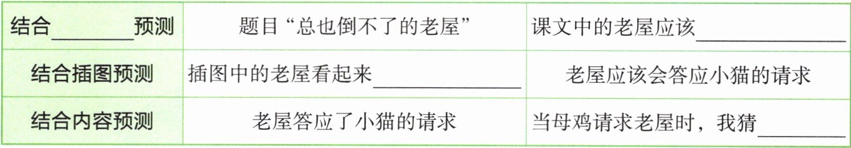 六、第一列:题目 第二列:很慈祥 第三列:不会倒下 老屋会答应 解析:此题主要考查运用三种预测方法——结合题目预测、结合插图预测、结合内容预测的能力。表格的第二、三列分别是预测的依据和结果,引导我们了解预测要有依据。