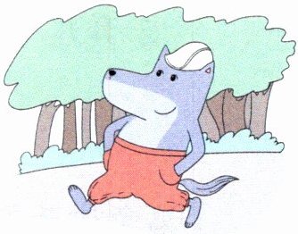 ①听说城里很热闹,笨狼就想去看看。他穿上红色的灯笼裤,戴上白色的鸭舌帽,唱着歌儿走出森林,来到了公路上。