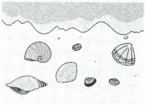 仔细观察右图中海滩上的贝壳,围绕一个意思写一写。