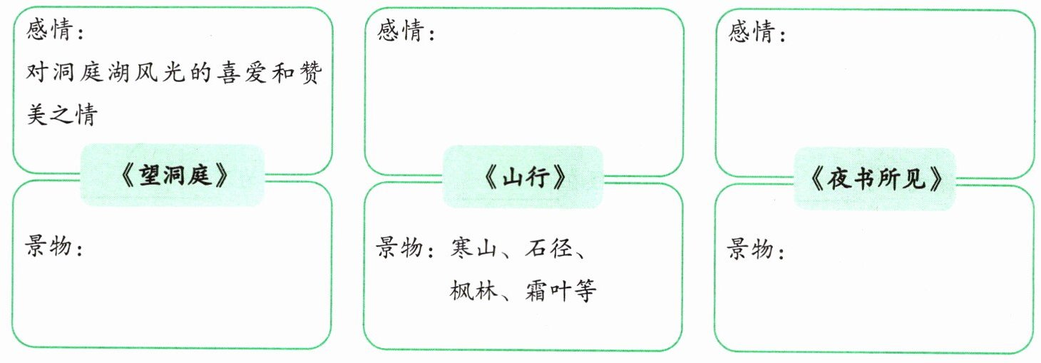 6.《望洞庭》:洞庭湖、月光、君山等 《山行》:对秋天的喜爱与赞美之情 《夜书所见》:思乡之情 梧桐叶、秋风、篱落等