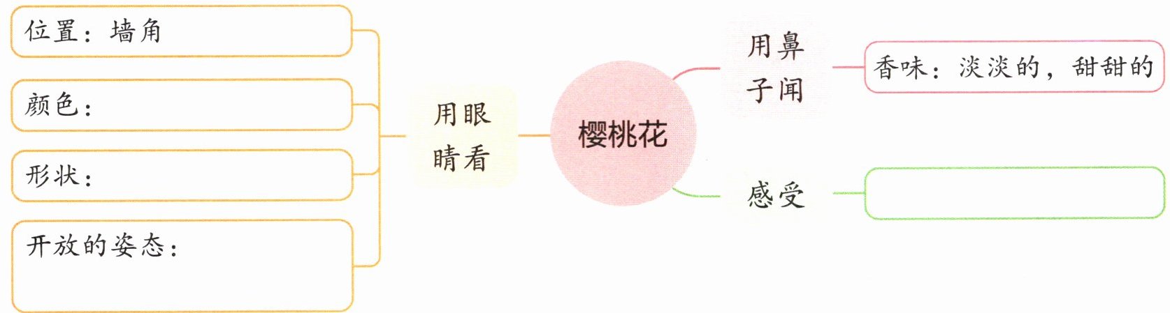 ”我深吸了一口气,樱桃花的香味顿时弥漫全身。1. 思维题 作者是如何观察樱桃花的?补全下面的思维导图。