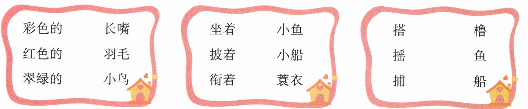 一、羽毛 母亲 使劲 船夫 翠绿 翠鸟 捕鱼 草地 喜爱 合拢 玩耍 盛开 钓鱼 张开 外祖父 静悄悄 蒲公英 一本正经