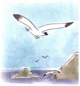 天空中飞着一群自由自在的海鸥,还飘着跟海鸥一样颜色的云朵。