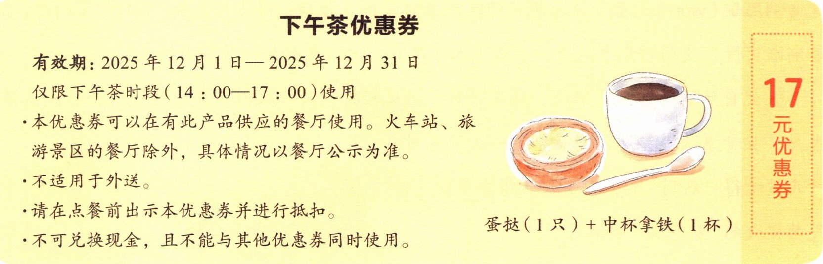 (4)买一只蛋挞和一杯中杯拿铁时,可以用这张优惠券抵扣 17 元。(