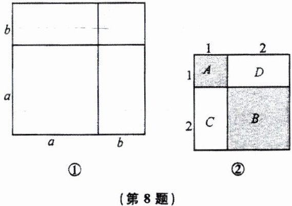 如图②,$A$表示1个$1×1$的正方形,即$1×1×1= 1^3$;$B$表示1个$2×2$的正方形,$C与D$恰好可以拼成1个$2×2$的正方形,因此,$B$、$C$、$D$就可以表示2个$2×2$的正方形,即$2×2×2= 2^3$;而$A$、$B$、$C$、$D恰好可以拼成一个(1 + 2)×(1 + 2)$的大正方形。由此可得$1^3 + 2^3= (1 + 2)^2= 3^2$。