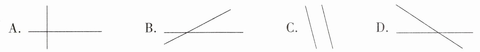 解析:本题考查垂线的定义,在同一平面内,当两条直线相交成$90^{\circ}$时,这两条直线互相垂直。逐一分析选项,只有A选项两条直线相交成直角。