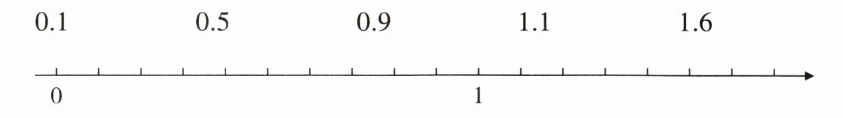 (在直线上0右侧第1个刻度处描点表示0.1;0右侧第5个刻度处描点表示0.5;0右侧第9个刻度处描点表示0.9;1右侧第1个刻度处描点表示1.1;1右侧第6个刻度处描点表示1.6)