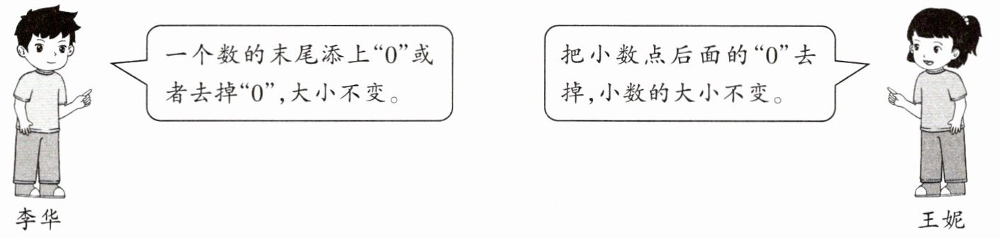 王妮:把小数点后面的“0”去掉,小数的大小可能会改变。例如$2.03$,去掉小数点后面的$0$变为$2.3$,$2.03\neq2.3$ ,只有在小数的末尾的$0$去掉才不改变大小,所以王妮说法错误。