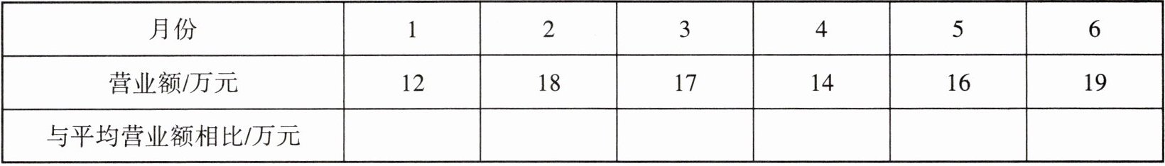 2. 把平均每月的营业额作为标准,超过平均营业额的部分用正数表示,低于平均营业额的部分用负数表示,请按此要求把上表补充完整。