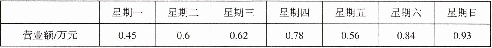 (1)因为$0.93\gt0.84\gt0.78\gt0.62\gt0.6\gt0.56\gt0.45$,所以星期日的营业额最多,星期一的营业额最少。