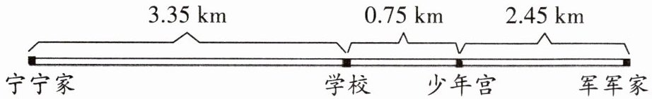 (1)从线段图中可知,宁宁家到学校的距离是$3.35$千米,学校到少年宫的距离是$0.75$千米,少年宫到军军家的距离是$2.45$千米。