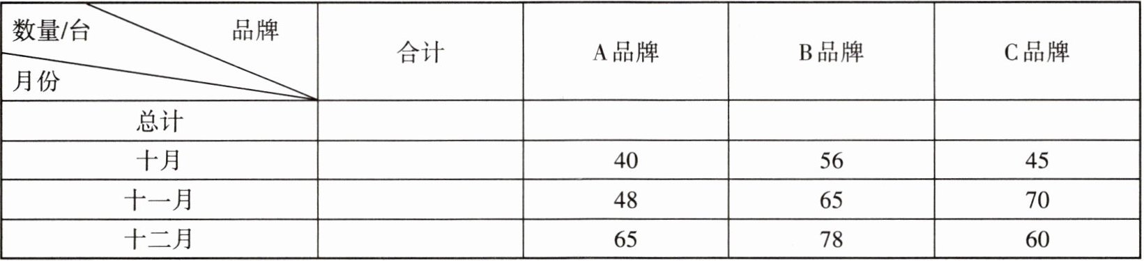 | 数量/台 | 品牌 | 合计 | A品牌 | B品牌 | C品牌 |