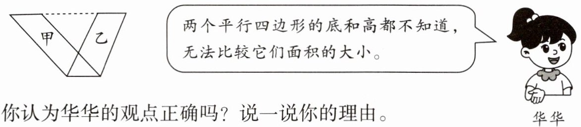 华华的观点不正确。因为甲、乙两个平行四边形等底等高,根据平行四边形面积公式$S = a× h$,等底等高的平行四边形面积相等,所以甲、乙两个平行四边形面积一样大。